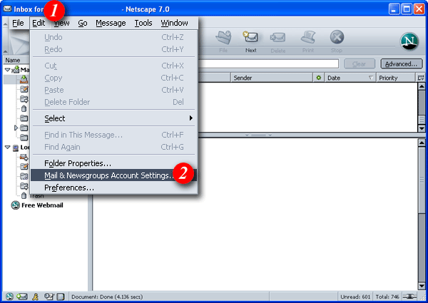 | 3)The left pane displays the accounts and folders you have previously setup. If you're running Netscape or Mozilla for the first time this area will not display any account details (as above). |
